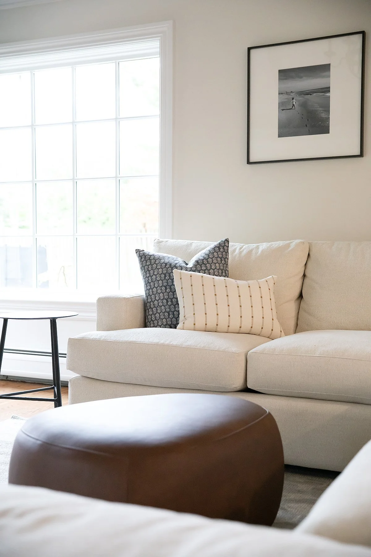 New Project Reveal! Today I am sharing a family room that I recently photographed after a furnishing project earlier this year. This room was a blank slate as my clients were moving from an apartment into a house and needed to fill this room. A big comfortable sectional was a must and we incorporated a beautiful rug and leather ottoman for a variety of textures along with some fun accent pillows.