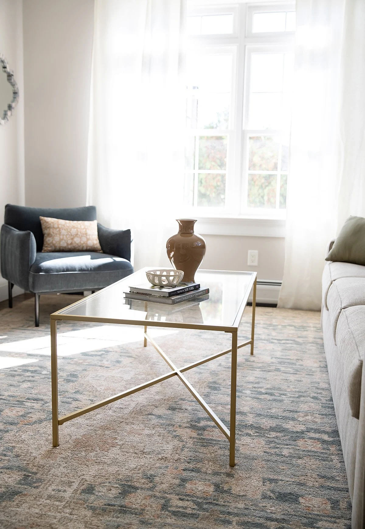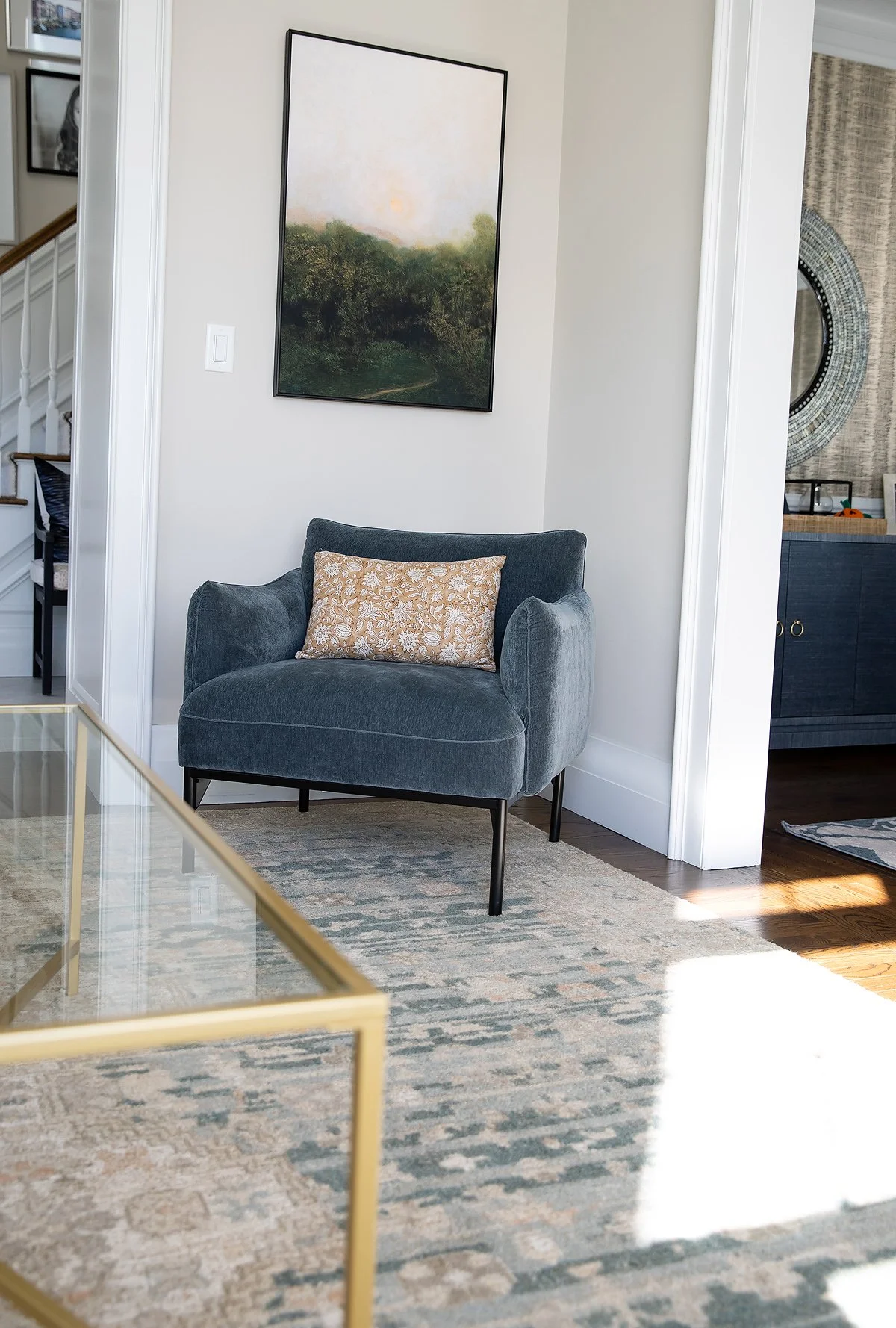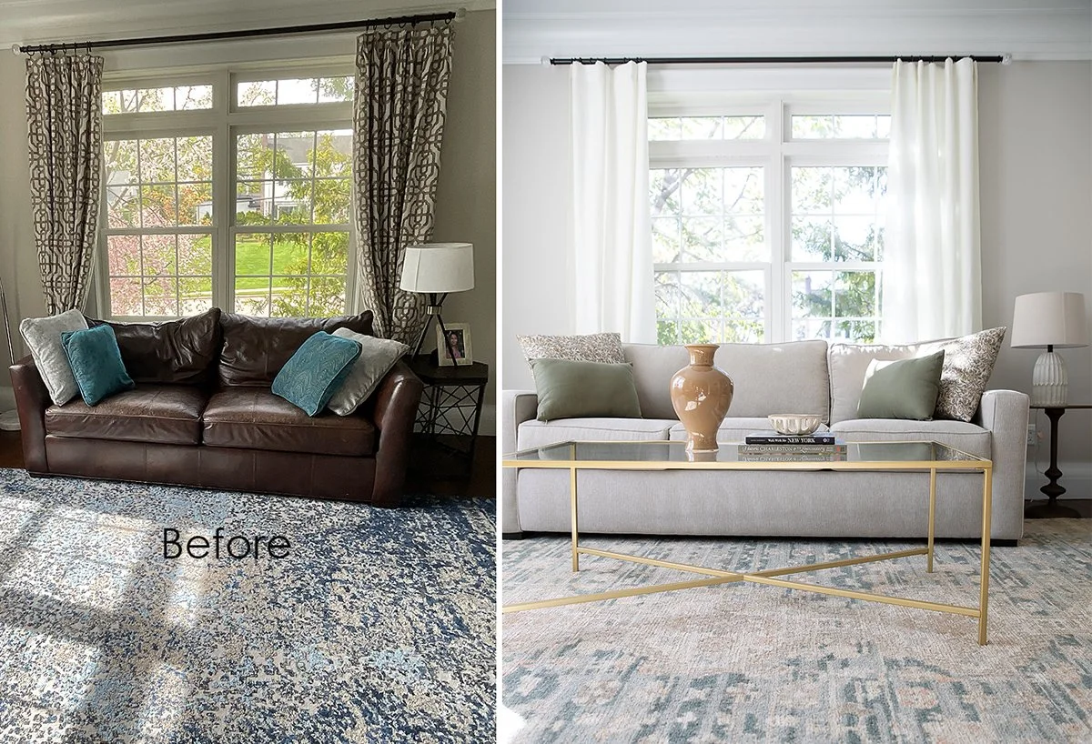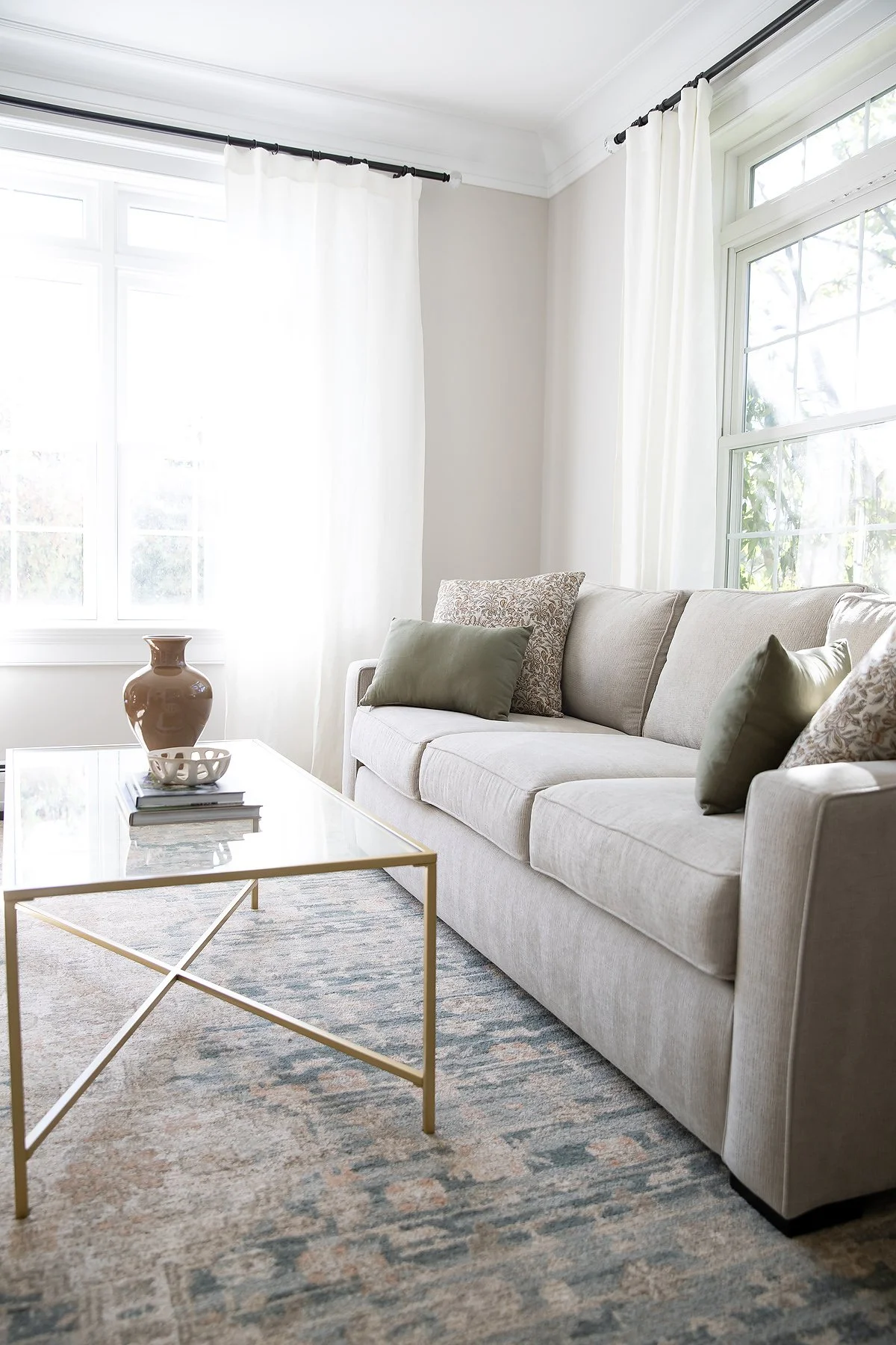 I am so excited to share this living room transformation that I just photographed this week. I was so happy to hear my client tell me that even her kids are now enjoying spending time in their βnewβ living room. We brought in some soothing colors that feel so warm and welcoming. We also mixed metals in the space between brass and black and brought in some beautiful textures with the pillows and gorgeous wood rug.