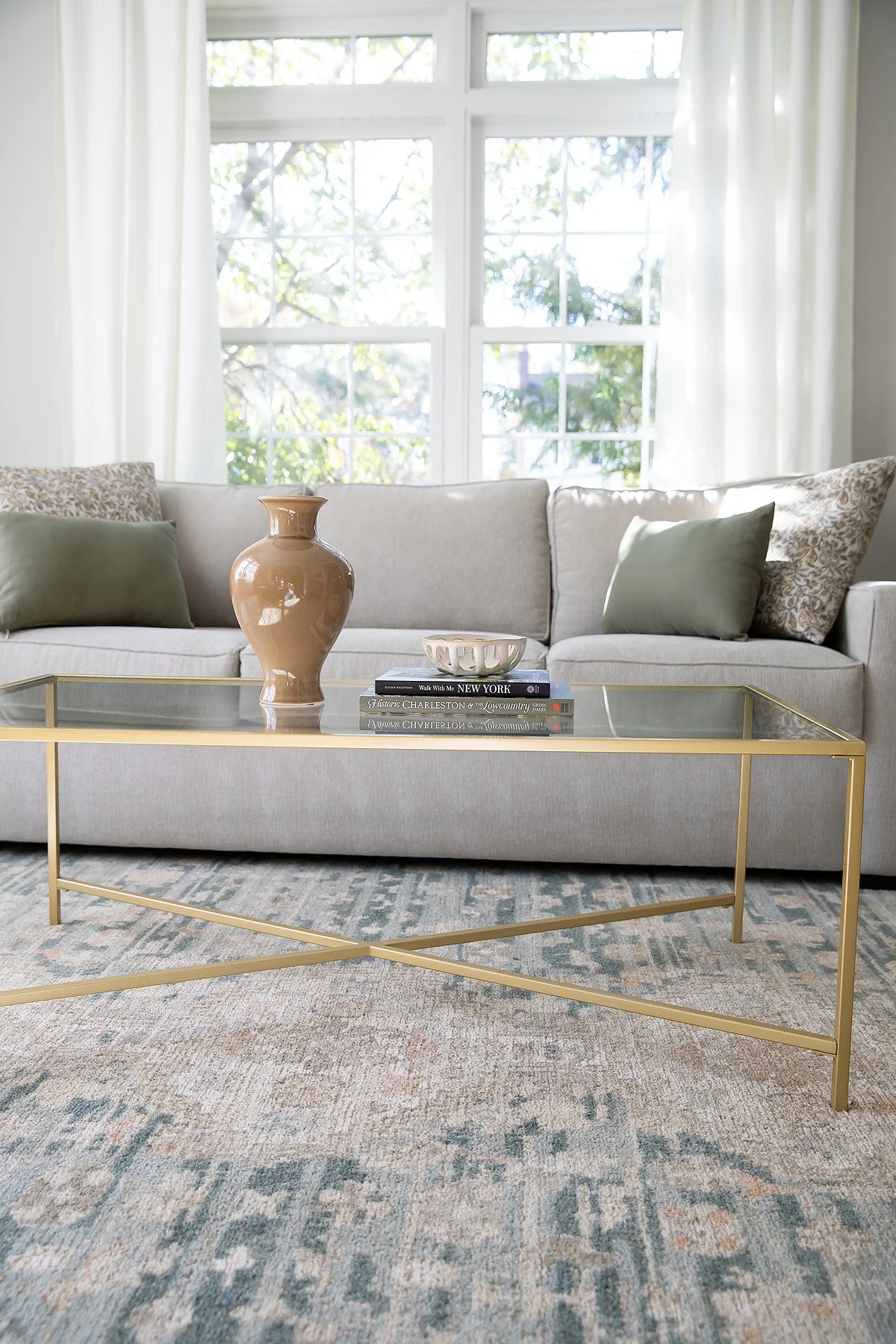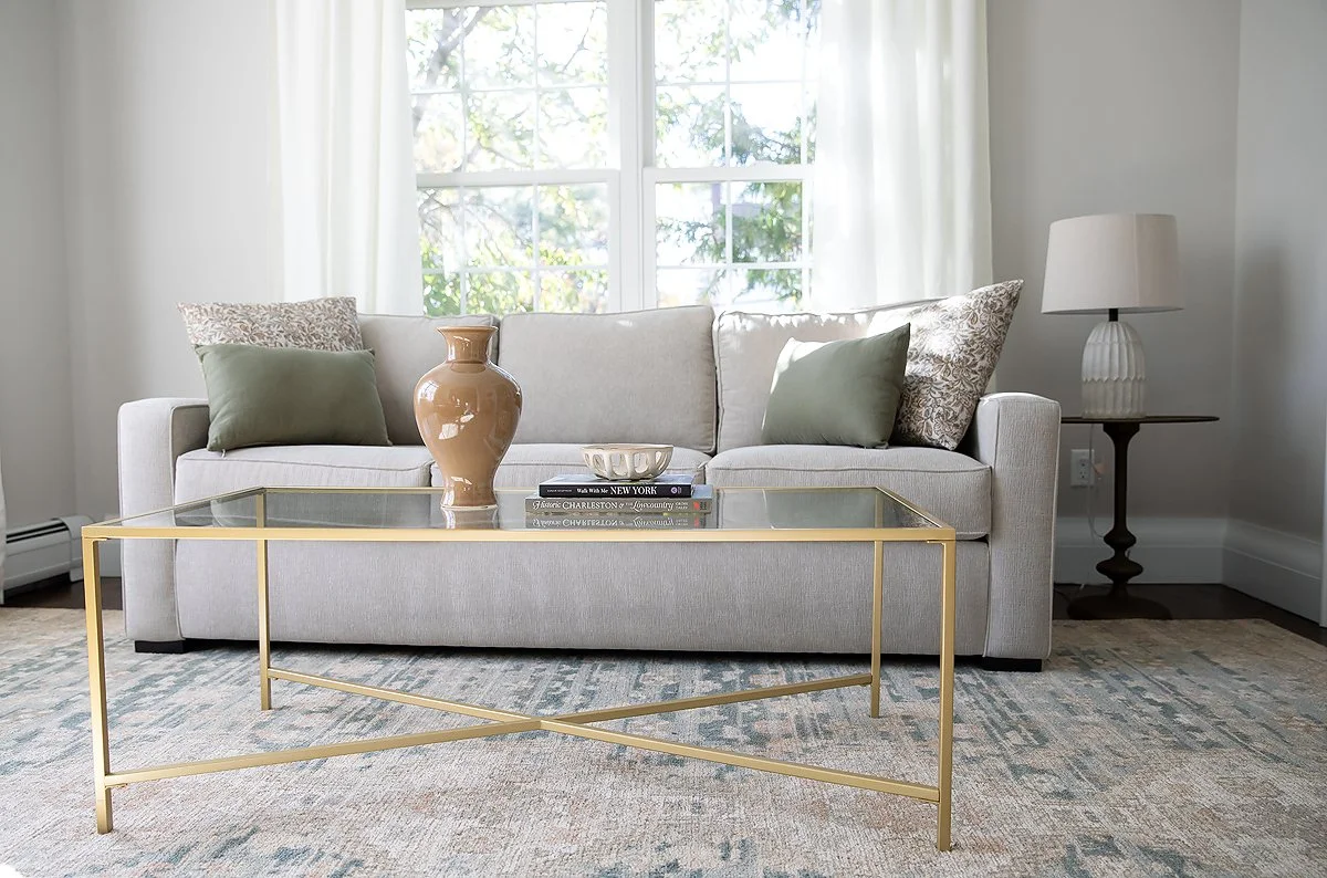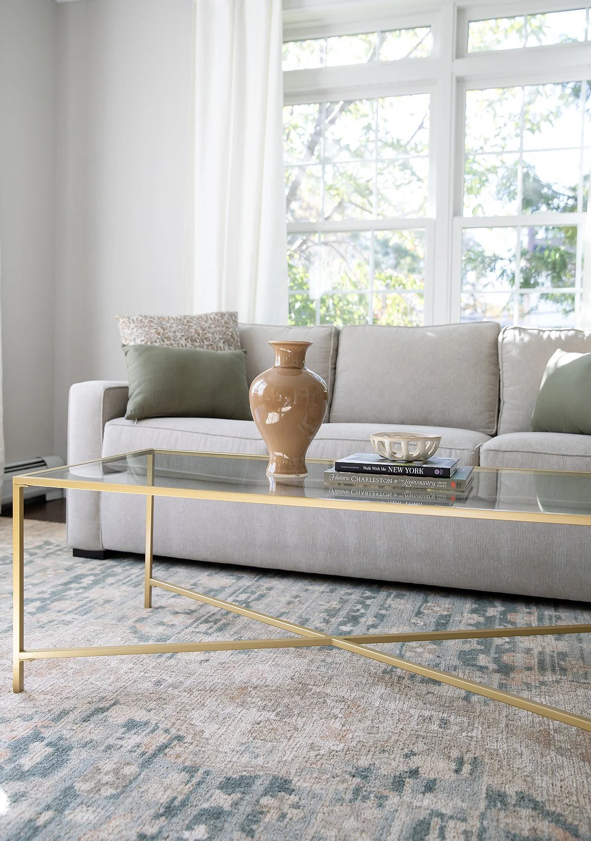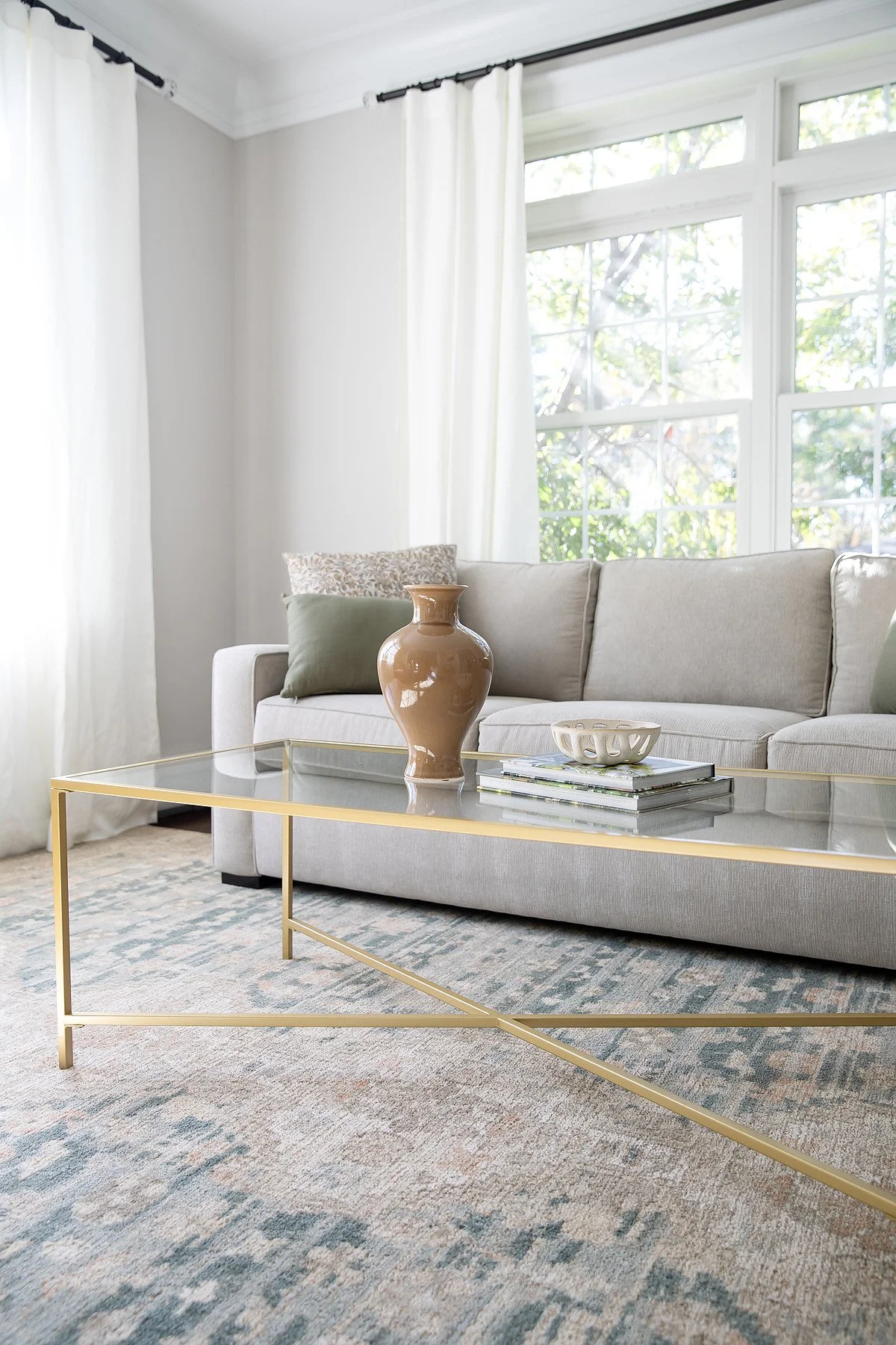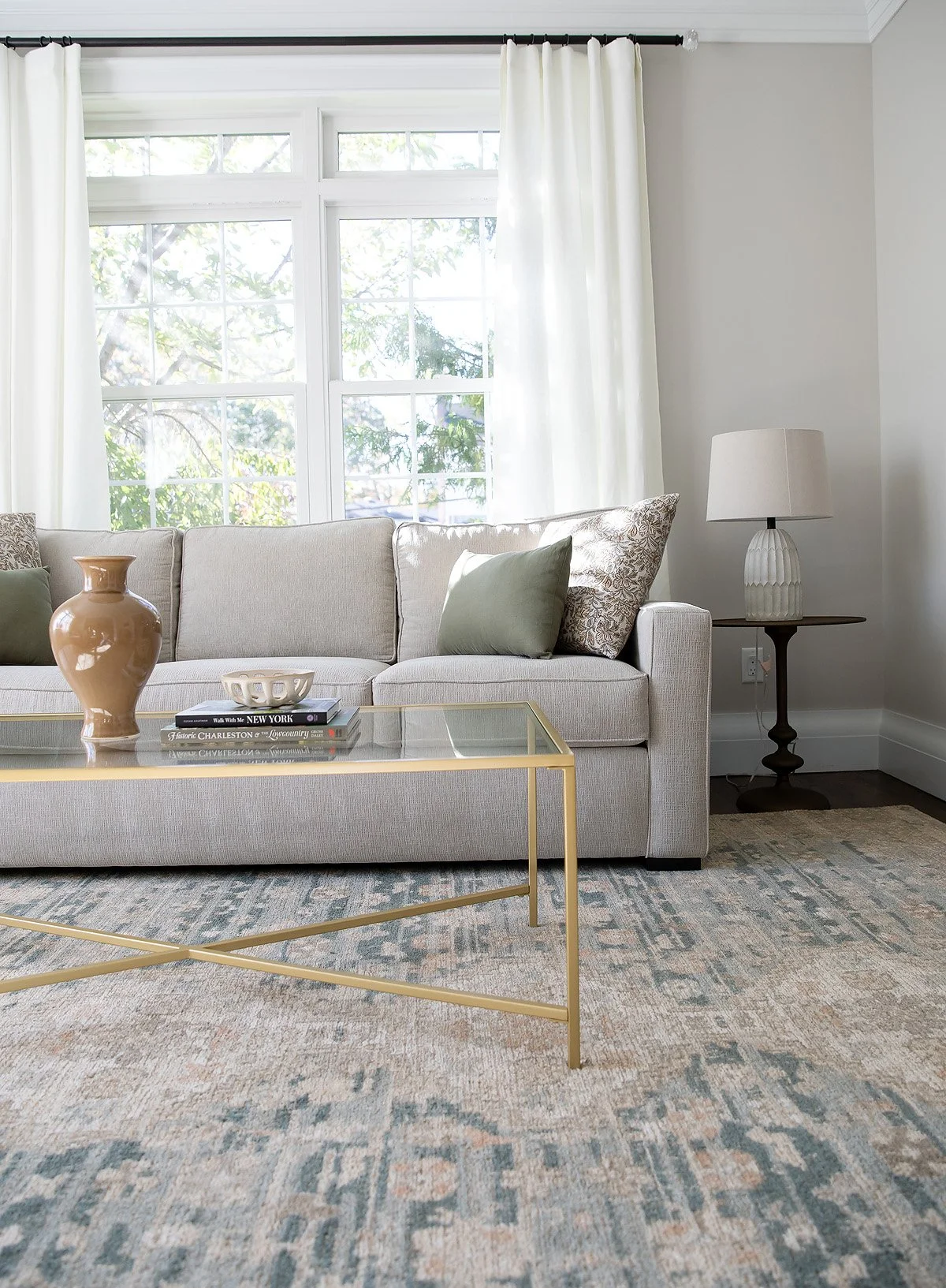 I am so excited to share this living room transformation that I just photographed this week. I was so happy to hear my client tell me that even her kids are now enjoying spending time in their βnewβ living room. We brought in some soothing colors that feel so warm and welcoming. We also mixed metals in the space between brass and black and brought in some beautiful textures with the pillows and gorgeous wood rug.